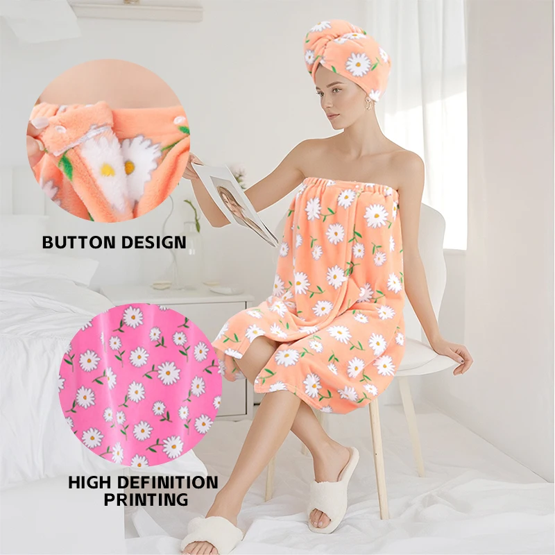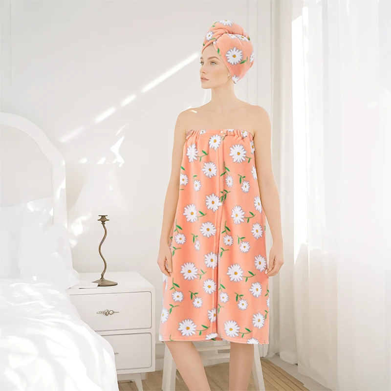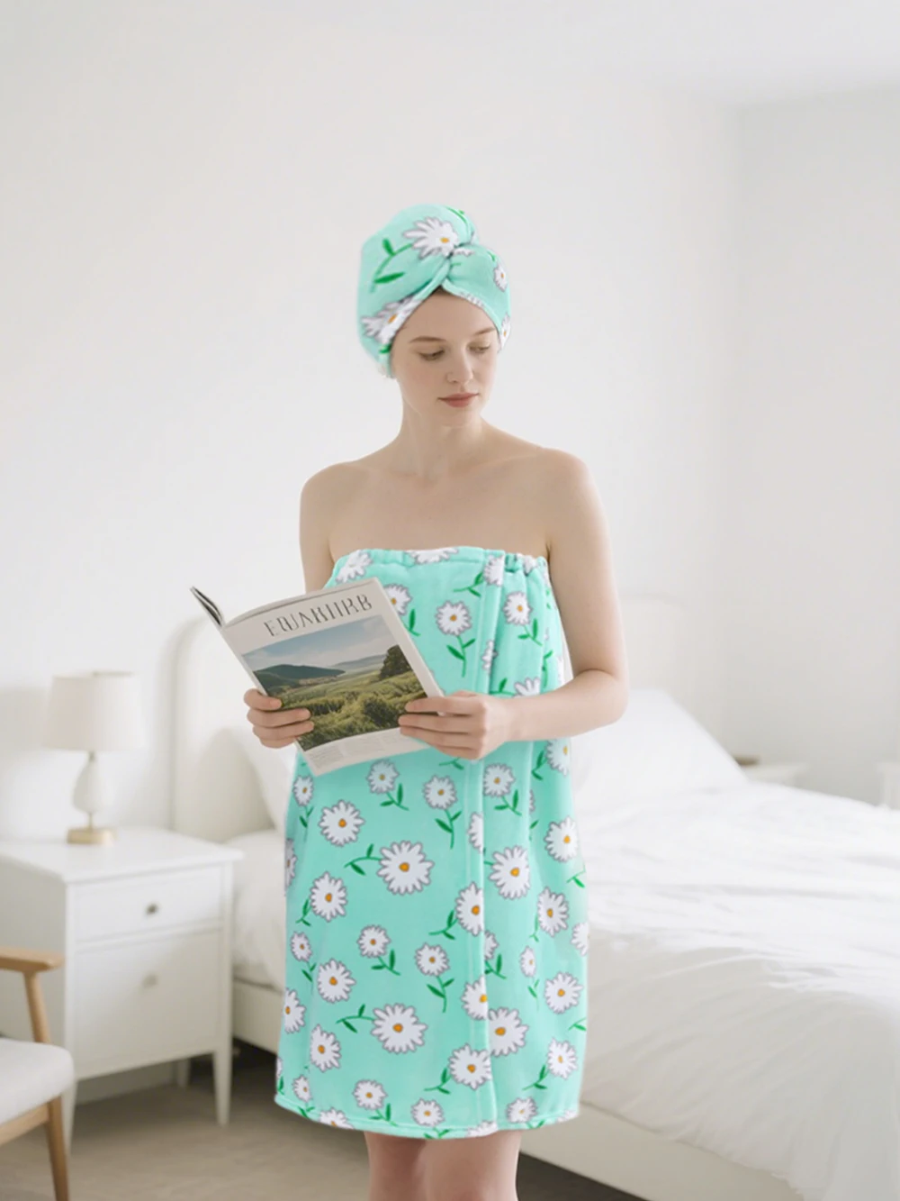 2 Pcs Combination Set Bath Skirt + Shower Cap Daisy Pastoral Style Wearable Bath Towel Skirt Hair Wrap Flower Soft & Absorbent