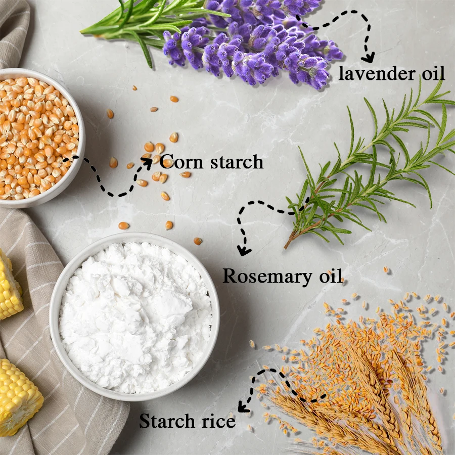 Zea Mays (Corn) Starch, Oryza Sativa (Rice) Starch, Silica, Rosmarinus Officinalis (Rosemary) Leaf Oil, Mentha Piperita(Peppermint) Oil, Lavandula Angustifolia (Lavender) Oil, Tocopherol.