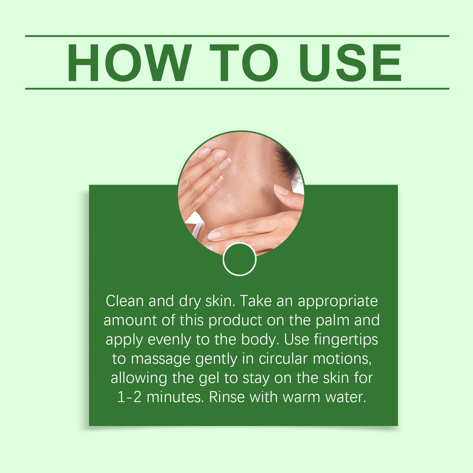 Clean and dry skin. Take an appropriate amount of this product on the palm and apply evenly to the body. Use fingertips to massage gently in circular motions, allowing the gel to stay on the skin for 1-2 minutes. Rinse with warm water