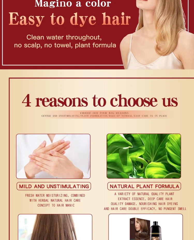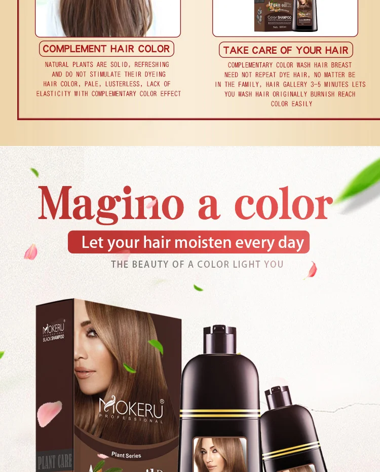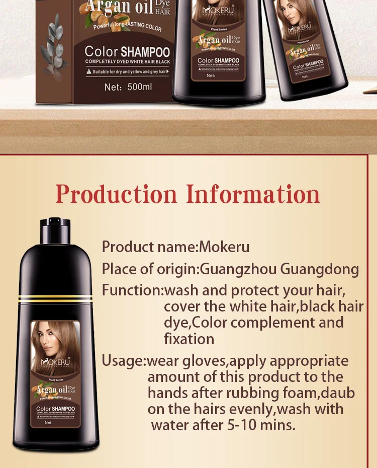 Mokeru Argan oil Black Hair Shampoo is a kind of shampoo which can dye your hair into black in 5-25 mins and specially designed to make your hair black shinning just through the ordinary process of washing hair at bathroom. Argan oil Black Hair Shampoo ,It is also nourishes, protects and repairs scalp. Compared to the traditional hair dye, it has the advantage of low cost, time-saving convenience.