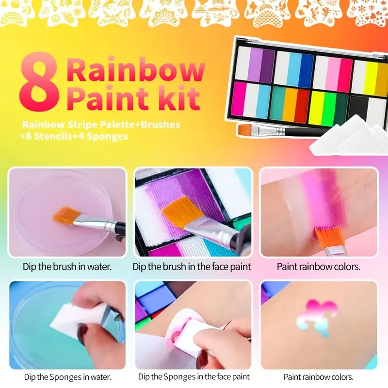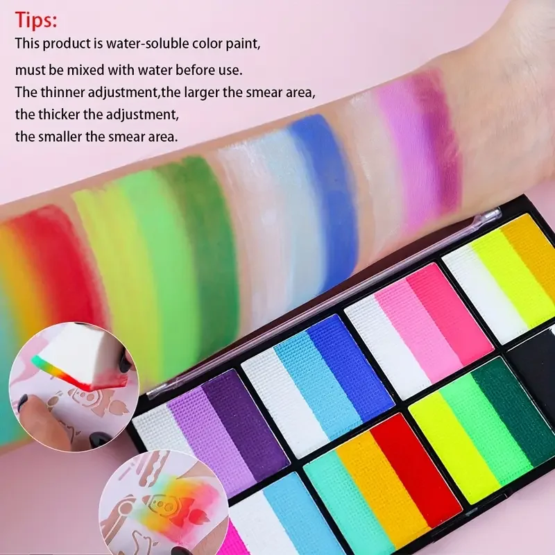 Palette Rainbow Stripe Paint Set with Brushes, Water Based Dual-Tone Face and Body Paint Palette, Christmas Halloween Cosplay