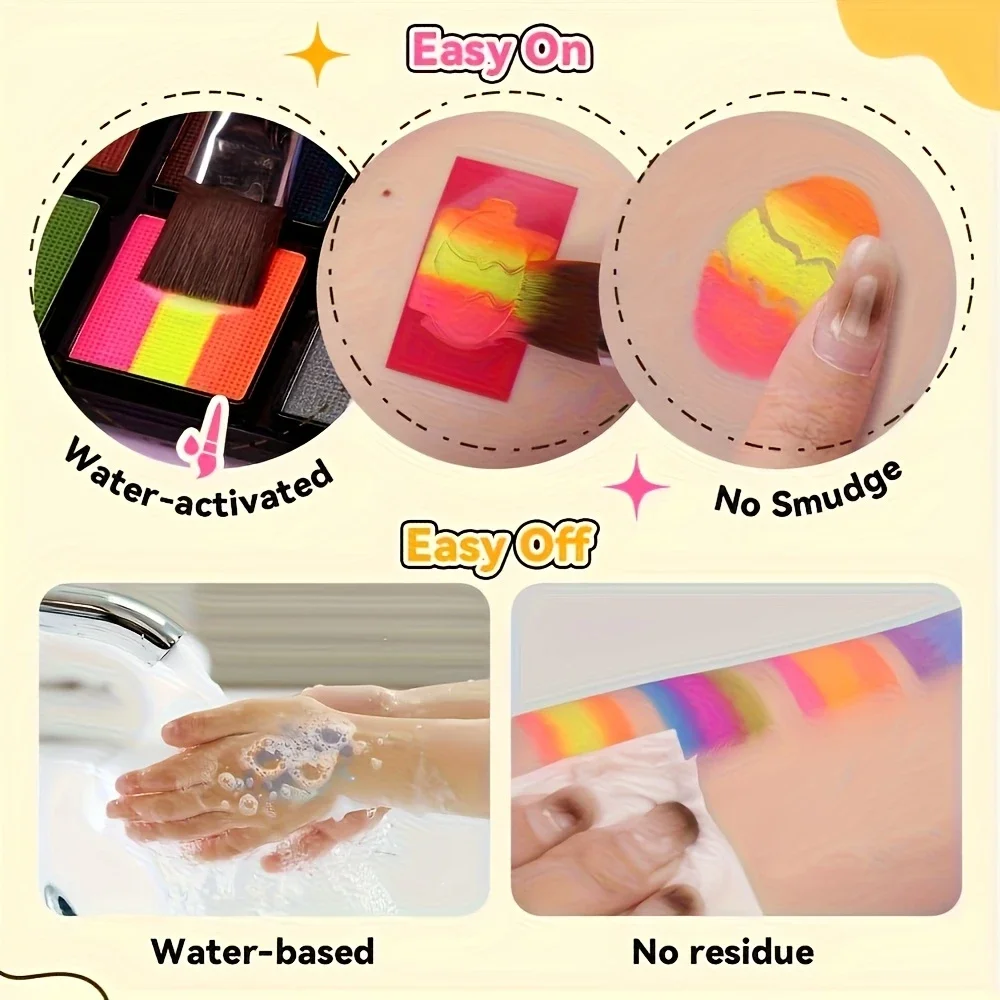 【Easy to Apply and Clean】: The face paints dry pretty fast, which will last long time and always present vibrant colors. They are easy to wash with soap and water after the party.
